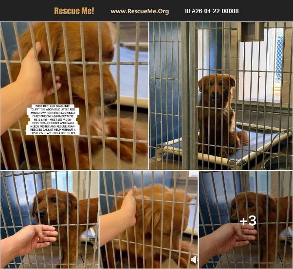 4/26 deadline!!!! CODE RED AT PHOENIX, AZ- ID #A5162995 -'CLIFF' THE ADORABLE LITTLE MINI CHOW/ GOLDEN RETRIEVER LOOKING X AT MARICOPA COUNTY ANIMAL CARE, WEST LOCATION- RESCUE ONLY (NHO) - MUST SEE VIDEO- HE IS TOTALLY SWEET and calm NEEDS FOSTER AND RESCUE ASAP-RESCUES CANNOT HELP WITHOUT A FOSTER AND PLACE FOR A DOG TO GO! SHY AT SHELTER SO MADE RESCUE ONLY! NOW ON DEADLINE FOR 4/26 TO COMMIT OR 'May be at risk for euthanasia 4/27/26 or sooner if warranted' per shelter. THUS, HE WILL LIKELY BE EUTHANIZED 4/27 in AM. HE IS 'RESCUE ONLY' BY A 'NEW HOPE PARTNER ONLY' which means he can NOT be adopted from the shelter directly, and a New Hope partner must pull him out. We can connect you to a rescue if you can foster or foster to adopt. Emergency/soon to be euthanized! We are in urgent need of finding a kind foster, or foster to adopt for dear 'CLIFF', a sweet young boy who looks like a mini Chow/Golden Retriever mix weighing only 39 lbs and estimated to be only 2 years old. He was found as a stray by a good Samaritan and it was reported she: 'STUMBLED ACROSS A DOG THAT WAS SITTING IN FRONT OF HER DOOR. UPON APPROACH, THE DOG WAS BARKING AT THE FINDER. THE FINDER LEFT AND WHEN SHE RETURNED AROUND 2PM, THE DOG WAS STILL THERE. FINDER THEN GAVE HIM WATER AS HE WAS LAYING DOWN.FINDER'S DAUGHTER APPROACHED THE DOG AND HE NO LONGER WAS BARKING AND ALLOWED ALL PETTING. FINDER'S DAUGHTER WAS ABLE TO PICK UP THE DOG AND PLACE INSIDE THE VEHICLE.' Despite him being easy to handle by the finder and her minor daughter, Cliff was sadly made Rescue only because he was scared at the shelter. He unfortunately has been placed on a short deadline before being euthanized. His additional behavior and medical details may be found on this link: https://apps.pets.maricopa.gov/pri.../Details/OTI5-MzM5-MTBB Following this, a volunteer just visited with Cliff, and you can see how this boy warmed up and seeks attention and love in the video provided. We are urgently looking for ideally a foster or foster to adopt for Cliff. This shelter has made many chow and chow mixes Rescue only, and already killed many who were also shy and young adults. Please do not let this young boy meet the same awful fate. If you may be interested in fostering, fostering to adopt, or helping in some other way (ie., pledging for his rescue), please email: [email protected] asap at Southern California Chow Chow Rescue Network who is trying to find placement asap, AND also fill out a foster application on https://dogfoster.org/ and https://azfosters.com/ so all entities can work on pairing a foster to a rescue group to help. Rescues can assist with neuter and medical. Rescue groups may contact the shelter directly at [email protected] and by calling 602-506-7387 and providing ID. Cliff's facebook post with updates, additional pictures and videos are posted here: https://www.facebook.com/783968124/posts/10168880666043125/?mibextid=wwXIfr Note: to view contents of links you will need to copy and paste each one separately into your browser.