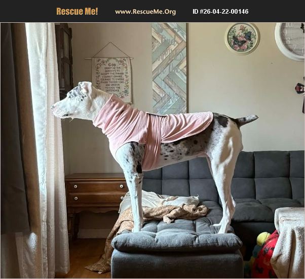 Speckles is a beautiful double merle Great Dane with a heart as big as her paws and a spirit that shines through in everything she does. This beautiful, deaf girl has learned to navigate the world in her own unique way, relying on her keen awareness and deep connection with her people. True to the Velcro Dane nickname, Speckles forms strong bonds and thrives on companionship. She wants to be near her humans as much as possible, finding comfort and joy simply by being by your side. Her affectionate nature makes her an incredibly loyal and loving companion. Speckles is house trained and understands the routines of home life well. While she is familiar with a crate, it tends to cause her anxiety, so she would do best in a home where crating is not necessary and she can feel safe and secure in a more open environment. She gets along well with other dogs when given proper, thoughtful introductions. With a little patience at the start, she settles in nicely and can enjoy the company of her canine companions. Speckles has a bit of a story written on her-she carries some scarring around her neck from a prior injury. Because of this, she wears a thunder shirt to provide gentle pressure and protection, helping prevent her from re-injuring the area. It also brings her an added sense of comfort. Speckles would do best in a home where she can be close to her people and not left alone for long periods. A family experienced with deaf dogs-or willing to learn how to communicate with her through touch and visual cues-would be ideal. A calm environment, patient introductions to other dogs, and a crate-free lifestyle will help her thrive. Most of all, she needs a home full of love, understanding, and the kind of devotion she so freely gives in return. White Kisses requires all dogs to be in training within thirty days of adoption. Training is crucial for dogs to learn lifelong skills and to understand their place in the family pack. It is also essential part of getting to know each other and to help your pup become a well-mannered adult GREAT Dane! For more information about White Kisses adoption process and an application please visit www.whitekissesgreatdanerescue.com/adopt