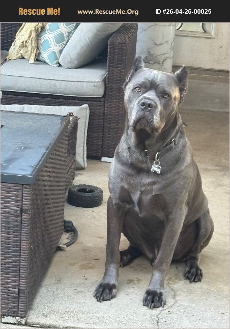 This is Hank. He is a purebred cane corso. He is a dominant male who is treat driven and loves to play with toys. He loves to snuggle and get lots of pets. His main owner suffered a heart attack and is on life support. He does not do well with cats or small dogs. Unsure how he would do with larger females. He knows how to sit. He is crate trained and house trained. He doesn't get a lot of walks but he does love to go on them. He loves to go on car rides and take baths.