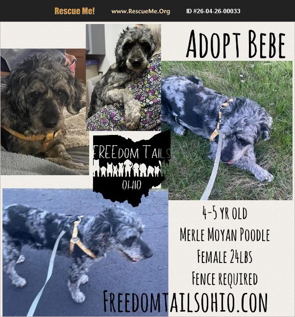 Ready for adoption Adopt BeBe 5-6 year old 24lbs Fully vetted female Moyan poodle Fence Required Timid Bebe is a retired momma from a commercial Breeder. She is new to a life of living in a home with people who want to love and care for her. She is still very timid and will hide to feel safe. She does like to sleep on her foster mom's bed now that she knows and trusts her. Everyday she is getting more social and comfortable. She will need an adopter that can give her time and patience to continue to build trust She is good with other furry friends and may need a furry friend to show her the way. If interested: Apply at freedomtailsohio.com