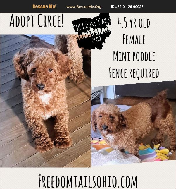 Adopt Circe 4.5 year old mini poodle Female Fully vetted Working on leash walking Small fence preferred Circe is as Circe is as sweet and loving as they come!! She follows her foster mom around in the house and in the fenced in yard. She sleeps quietly in a crate at night, and when her foster mom is not home. Circe would make an excellent companion for a single person or a family with children over 8. She loves all the other pups in the home. Circe came into foster care with an odd haircut. The hair growing back is silky and smooth. Her foster mom can see the tips of the lighter brown curly hair beginning to grow as the silky hair gets longer. It makes her unique. Circe loves soft blankets. Apply to FREEdomTailsOhio.com
