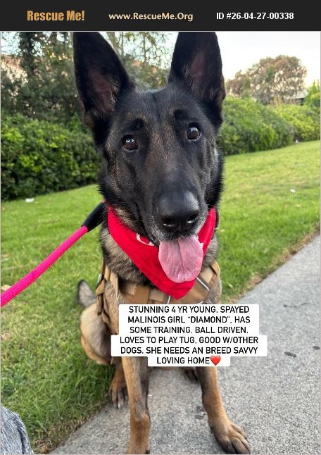 Courtesy Posting: 'DIAMOND' Venice, So Cal 'Saving Gizmo's Friends' 'Diamond' is a stunning 4 yr young, spayed female Belgian Malinois who is looking for her breed savvy forever, loving home. She has ball drive, protective instincts and knows to position herself between her handler's legs. She loves to play tug! Diamond is great w other dogs but doesn't like to engage in play. She's good w people coming into the house but outside she has a bit of reactivity. She's goes into protection mode. She's definitely had some kind of k9 training. She goes between her handler's legs and looks up at you. She will need an experienced owner who understands the breed. She was rescued by 'Saving Gizmo's Friends' and was pregnant; however she lost all of her puppies as she had pneumonia! If you are interested in adopting her, please email Cassandra at: [email protected] We have additional photos and videos on her Facebook post at: https://www.facebook.com/debbie.alder.14/posts/pfbid02E1dkuMc7Z8inwkuAVFC34Lc4tnBM2XSY3onbwAy1Fr6E73nVwKTgWfY5LYB2MXMul To view contents of link you will need to copy and paste it into your browser.