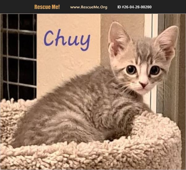 This good looking kitten is Chuy. He is a busy boy, loves to wrestle, and his favorite thing to do is eat! Always the first when mealtime comes around. Chuy will need an active household or a buddy. In foster care he was not around children or dogs.