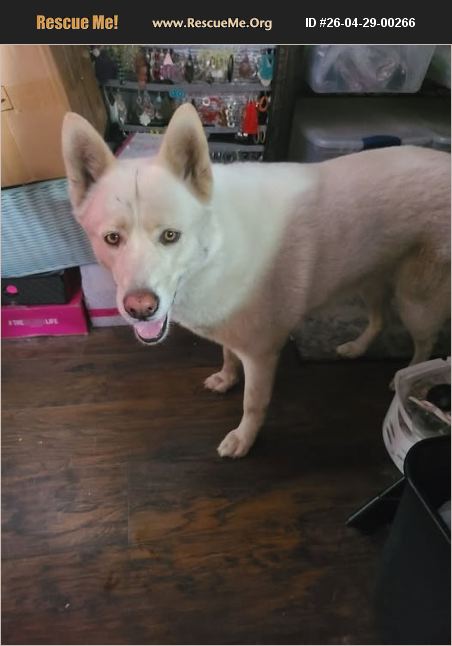 White Siberian Husky, black spot on right hip Very sweet, loves kids, sits when told, talks a lot. Lets you know if she is low o water or food. Loves to go on walks, She gets excited when she sees her leash.